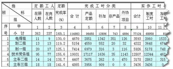 班组定额完成明细表反映了车间内各班组的月度工时完成情况和工时的各部分组成明细,清晰地反映了各班组定额完成率。而班组个人工时月度明细表则详细反映了个人的工时完成情况。