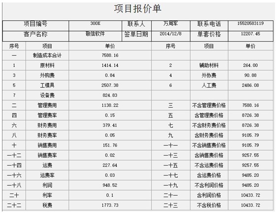 敬信工时定额管理系统可根据零件生产过程所需的原材料、辅助材料、外购费、外协费、工模具、人工费和设备费统计制造成本,并按照管理费率、财务费率、销售费率、运费、利润等增加相应费用,快速生成项目报价单。