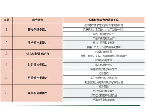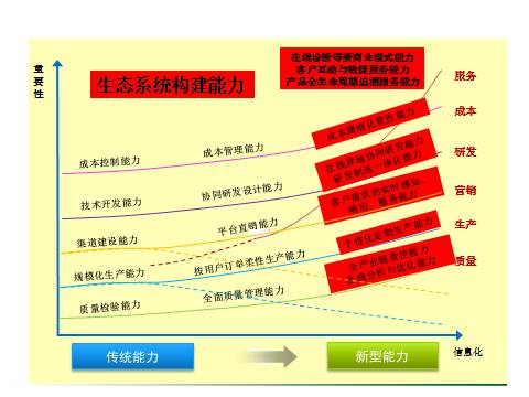 企业在实践中也体会到,无论是两化融合,还是工业4.0、智能制造,最终都需要把这些信息技术、设备、软件、管理以及企业的战略调整、业务优化等转化成企业的核心能力:从传统能力拓展到新型能力,如成本精细化管控能力、在线异地协同研发制造一体化能力、客户需求的实时感知响应和服务能力、个性化定制生产能力、全产业链产品质量在线分析与优化能力、产品全生命周期追溯服务能力、客户互动与敏捷服务能力等,对于行业领军企业而言,还要考虑如何打造产业生态系统的构建能力。这是企业两化融合的终极目标。