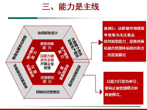 第三,能力是主线。培育新型能力是两化融合管理体系的主线,企业推进两化融合过程中技术、装备、系统、流程、管理、组织、商业模式、发展战略的创新、调整、优化,最终都要转化成企业的新型能力、转化成企业的竞争优势,转化成成本、质量、效益、服务以及市场占有率、客户满意度、劳动生产率等的提高。两化融合管理体系的核心就是要以能力打造为牵引,重构企业管理模式和商业模式。