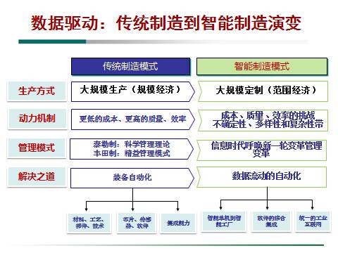 回顾200多年的制造业,工业的发展历史和新一轮技术变革带来的未来就业趋势,可以分为两个阶段:传统制造业模式和智能制造模式。从根本上来说,传统制造模式的生产方式是大规模生产,大规模生产能够解决工业生产过程中面临的三个基本问题:更低的成本、更好的质量和更高的效率。从企业管理的角度来看,人们基于对两百年来工业大规模生产的系统研究提出科学管理等新理论,并在指导工业发展的实践中不断完善。今天,当以满足客户消费为最终目标、从大规模生产转向大规模定制时,面临个性化定制的成本问题、质量问题和效率问题,面临工业研发、生产、供应链、服务不确定性、多样性和复杂性的时候,传统的管理理念和理论需要进一步完善,企业家呼唤信息时代新一轮的管理变革,这种变革的核心就是要实现数据的自动流动。从传统制造业角度看,生产装备的自动化解决是大规模生产的问题(成本、质量和效益),而数据流动的自动化解决的大规模定制的问题,只有数据的自动流动,形成智能数据,才能从根本上解决个性化定制所带来的成本、质量、效果等问题,解决生产的不确定性、多样性和复杂性问题。这也是数据驱动企业的关键所在。