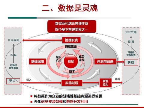 其次,数据是灵魂。在两化融合管理体系的总体架构图中,我们把数据放到了中心位置,我们强调数据是资产,数据是资源,数据作为一种新管理要素与传统技术、业务流程、组织架构相互影响、相互作用,支撑企业业务创新、管理创新和战略优化,数据是企业两化融合管理体系四个基本要素之一。数据的及时性、完整性、准确性,数据开发利用的深度和广度,数据流、物流、资金流的协同水平和集成能力,数据流动的自动化水平,乃至数据驱动型企业的形成,决定了企业未来核心竞争力的来源。两化融合管理体系的核心是数据,它强调数据和信息资源的开发管理应用及企业管理运营的核心地位和作用。
