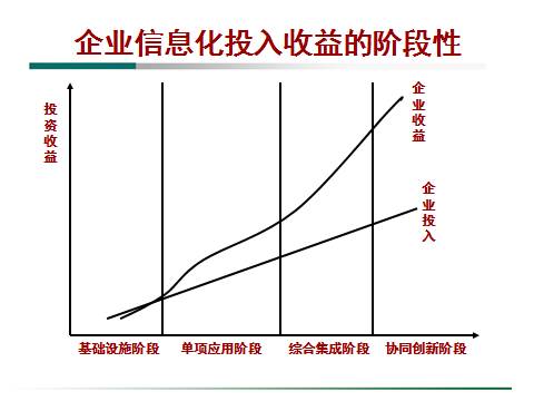 企业两化融合评估有一个重要结论——企业信息化投入和收益具有阶段性,企业只有迈过集成提升阶段,或者进入集成提升阶段后,企业的效益才会呈现出指数增长态势,这也充分体现企业推进两化融合过程中集成是重点、集成是难点的判断。