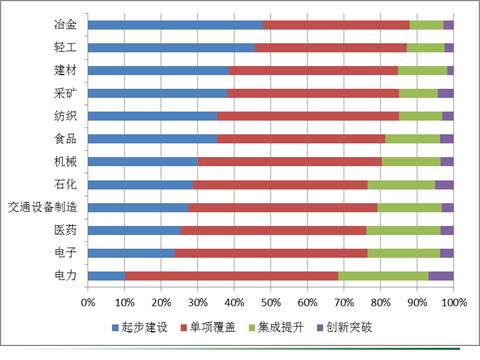 我们在对35个行业数万家企业两化融合发展水平评估的基础上,将企业信息化分为四个阶段:基础建设阶段、单项应用阶段、集成提升阶段、协同创新阶段,实现综合集成是企业两化融合发展阶段的重要标志。通过下表可以看出,我国大部分行业企业处于起步建设和单项覆盖阶段。处于集成提升阶段的企业占比较少,而且不同行业企业的集成水平也有差异,电力等行业集成提升阶段的企业占比较多,而采矿、纺织等行业处于集成提升阶段的企业占比较少。