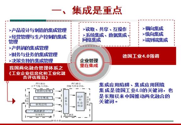 首先,集成是重点。早在五六年前两化融合管理体系启动阶段,组织开展两化融合水平评估的时候,我们就把集成作为企业信息化建设的重要内容,作为发展阶段的重要标志。我们当时就提出,企业开展两化融合难点在集成,重点在集成,突破点也在集成。当时,德国还没有提出工业4.0的概念。当前,集成应用是德国工业4.0的关键词,也是长期以来中国推动两化融合的关键词。《工业企业信息化和工业化融合评估规范》中的很多指标体现了集成的理念,如设计与制造的集成、经营管理与生产控制的集成、产供销的集成、财务与业务的集成、决策支持的集成,这些集成与德国工业4.0中的横向集成、纵向集成、端到端集成在理念上是完全一致的。